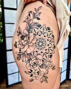 Working exclusively in black ink, her style also encompasses tribal work, blackouts, illustrative designs, bold florals, and striking high-contrast compositions.
